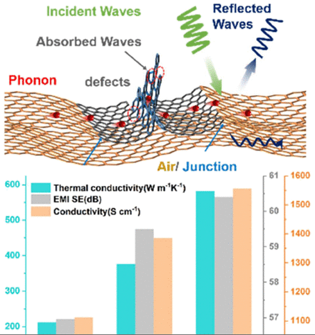 在本研究中,通过 ICP-PECVD 工艺在基底 GP 薄膜上原位生长了 VG,随后对复合薄膜进行了石墨化。研究了石墨化前后 VG 的形态和结构变化及其对薄膜整体热导率和 EMI SE 的影响。结果表明,VG 内部累积的缺陷以及 VG 与基底之间的界面可作为额外的极化中心,从而导致电磁波的极化损耗。此外,VG 的原位生长增强了薄膜的整体导电性,提高了其消散电磁波的能力。因此,GO/GP/VG 的 SE 和导电率分别达到了 56.95 dB 和 1111.27 Scm-1。然而,缺陷阻碍了声子传输,导致 GO/GP/VG 的热导率仅为 221.28 W m-1K-1。石墨化导致 VG 的边缘和缺陷减少。同时,大面积的连续基底层改善了基底表面 GP 薄膜之间的薄弱连接。