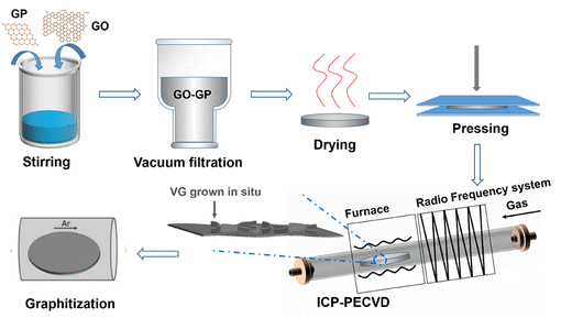 石墨烯薄膜尽管成本高昂,但在电子领域却有着广泛的应用。机械剥离是生产石墨烯(GP)的一种经济有效的方法,但它们之间薄弱的互连会对薄膜的性能产生负面影响。为了解决这个问题,本文,中南大学张明瑜 教授团队在《ACS Appl. Nano Mater》期刊发表名为“Vertical Graphene on Graphene Composite Film for Heat Dissipation and Electromagnetic Shielding”的论文,研究将添加了少量氧化石墨烯(GO)的 GP 分散液真空过滤、干燥并压制成氧化石墨烯/石墨烯(GO/GP)薄膜。然后,利用电感耦合等离子体增强化学气相沉积(ICP-PECVD)技术在 GO/GP 薄膜表面原位生长垂直石墨烯(VG),并在其后进行石墨化处理,从而制备出 RGO/GP/VG 复合薄膜。