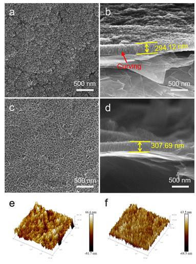 图1.(a、b)GO/GP/VG 的 SEM 图像。(c、d)RGO/GP/VG 的 SEM 图像。(e) GO/GP/VG 的 AFM 图像。(f) RGO/GP/VG 的 AFM 图像。