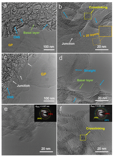 图1. (a) GO/GP/VG 的光场 TEM 图像。(b) RGO/GP/VG 的光场 TEM 图像。(c, e) GO/GP/VG 的 HRTEM TEM 图像。(d、f)RGO/GP/VG 的 HRTEM TEM 图像。