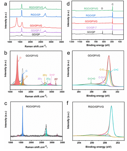 图3. (a) 薄膜的拉曼光谱。(b) GO/GP/VG 的拟合拉曼光谱。(c) RGO/GP/VG 的拟合拉曼光谱。(d) 薄膜的 XPS 光电子能谱。(e) GO/GP/VG 的拟合 XPS 光电子能谱。(f) RGO/GP/VG 的拟合 XPS 光电子能谱。