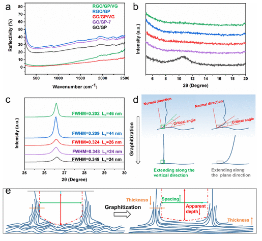 图4. (a) 薄膜的漫反射光谱。(b, c) 薄膜的 XRD 图谱。(d、e)石墨化过程中 VG 的结构演变。