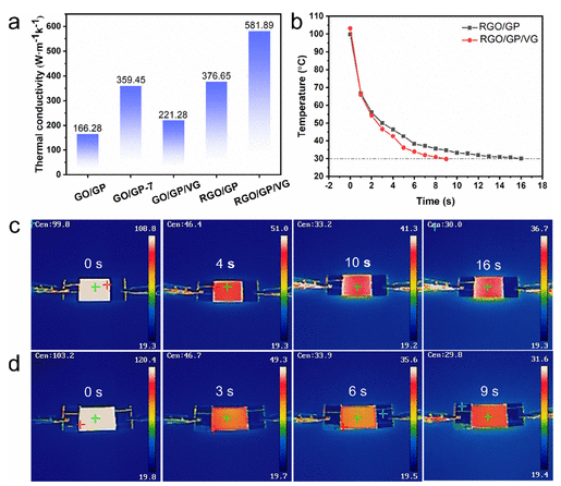 图5. (a) 薄膜的热传导率。(b) 薄膜的时间-温度散热曲线。(c) RGO/GP 薄膜散热时的红外热图。(d) RGO/GP/VG 薄膜散热时的红外热图。