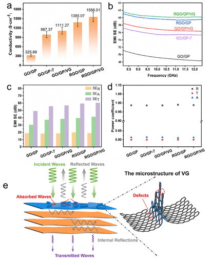 图6. (a) 薄膜的导电性。(b, c) 薄膜的电磁屏蔽系数。(d) 薄膜的电磁屏蔽功率系数。(e) 薄膜的电磁屏蔽机理。