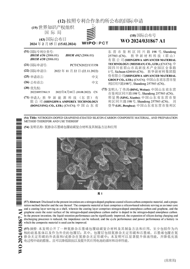 证券之星消息,根据企查查数据显示胜华新材(603026)公布了一项国际专利申请,专利名为“氮掺杂石墨烯包覆硅碳复合材料及其制备方法和应用”,专利申请号为PCT/CN2022/133358,国际公布日为2024年2月15日。