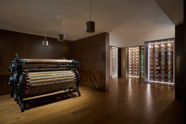 Loro Piana 通过实景装置揭开本系列的帷幕,以沉浸式的体验探索品牌的历史传承与高品质的纤维。体验活动从一台历史悠久的“fiori di cardo” 蓟花机开始,这种机器配备了干蓟花,在面料精加工的环节,用来对最高质量的羊绒进行刷绒与拉毛工艺处理。接着是一个私密的空间,展示着品牌的卓越经典:羊绒、Baby Cashmere 小山羊绒、Vicuña 骆马毛和 The Gift of Kings® 羊毛,以及 Sopra Visso 羊毛和 Pecora Nera® 羊毛,这两种标志性的纤维在本季回归。与此同时,Loro Piana 还展示了过去 100 年的纺织品档案书籍,讲述了丰富而迷人的创新与研究历史。
