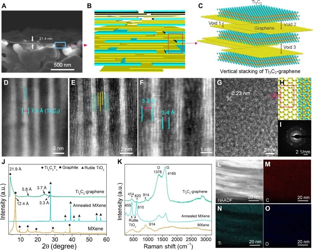 图 1 | 由交替堆叠的还原MXene(Ti3C2)和石墨烯组成的亚纳米异质通道膜的表征。