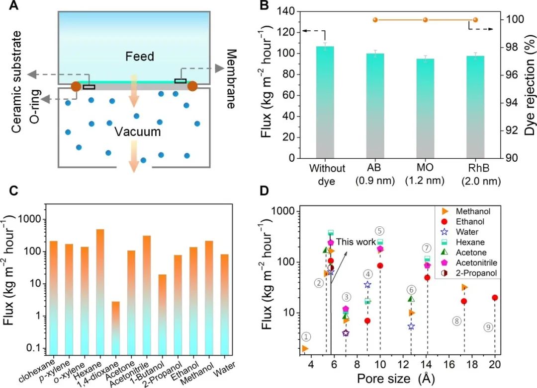 图 3 | 亚纳米异质通道对溶剂通量的影响。