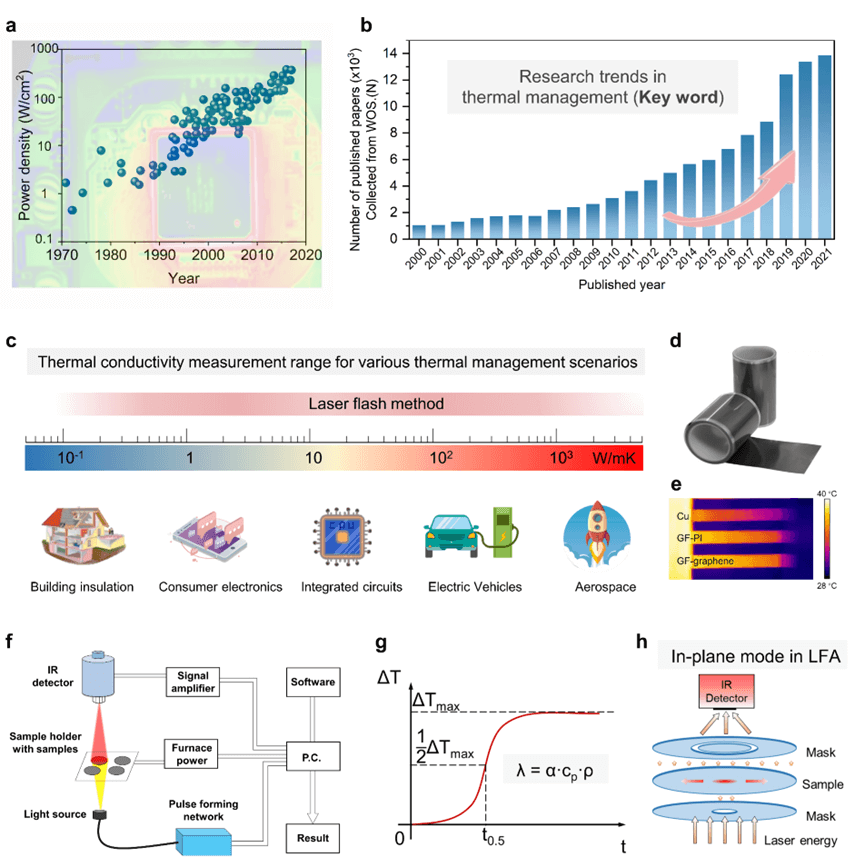 图1 (a)商用处理器的功率密度趋势和(b)过去几十年热管理领域的研究文章数量。(c)激光闪射法在各种热管理应用场景下的导热系数测量范围。(d)高导热石墨膜。(e)铜箔、聚酰亚胺基石墨膜和石墨烯膜散热时的红外图像。(f)激光闪射法测量热扩散系数的原理示意图。(g)激光闪射法中被测样品的理想温升曲线。(h) 激光闪射仪测量面内热扩散系数的示意图。