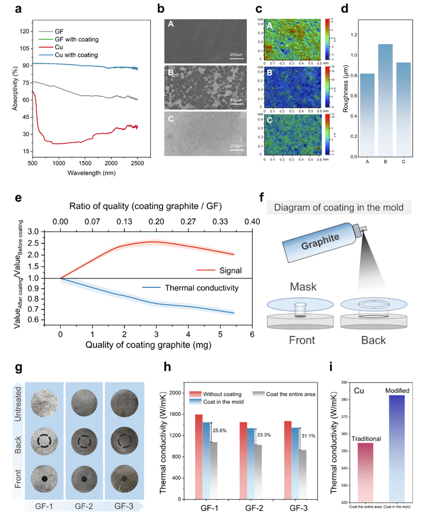 图2 (a)不同样品喷碳前后对红外光的吸收率。(b)不同喷碳状态的SEM图像。不同喷碳状态下的(c)光学轮廓仪图像和(d)粗糙度。三种喷碳状态分别为:A =未喷,B =未完全覆盖,C = 完全覆盖。(e)石墨涂层喷涂量对红外探测器信号及测量结果的影响。(f)改良的喷碳方法的示意图。(g)使用改良的喷碳方法前后的三种石墨膜。(h)三种石墨膜采用不同预处理方法得到的测量结果。(i)纯铜采用不同预处理方法得到的测量结果。