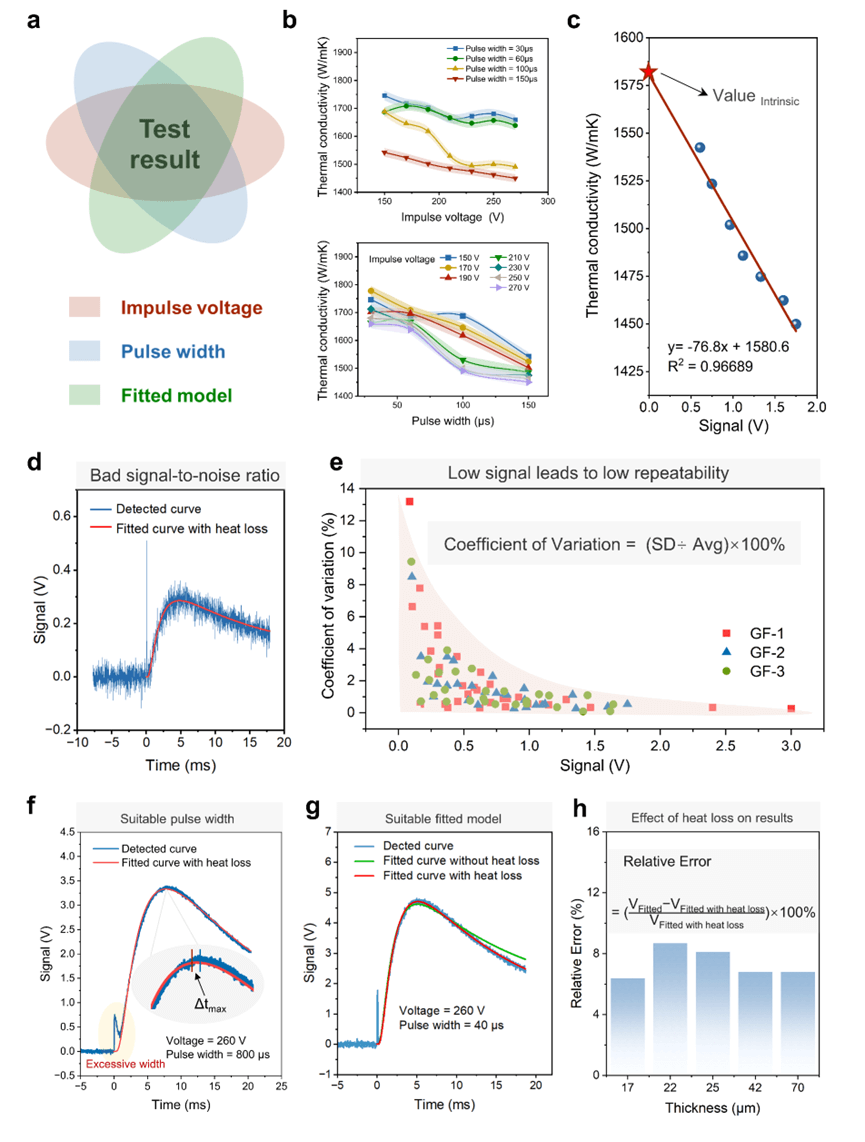 图3 (a)影响测试结果的参数。(b)同一样品在不同脉冲电压和脉冲宽度下测量得到的导热系数。(c)导热系数作为激光脉冲能量的函数。横轴表示红外探测器的输出信号,该信号用于表示激光脉冲能量,沿这条线外推至信号为0以得到固有导热系数。(d)信噪比差的温度曲线。(e)不同输出信号下测量结果的变异系数,其值反映了测量的可重复性。(f)脉冲峰值与温升曲线有明显重叠的温度曲线,其拟合曲线与实际曲线不匹配,造成t0.5的拟合误差。(g)是否计热损耗拟合得到的温度曲线。(h)拟合模型是否计入热损失的相对误差。(上述温度曲线拟合均已加入脉冲修正)