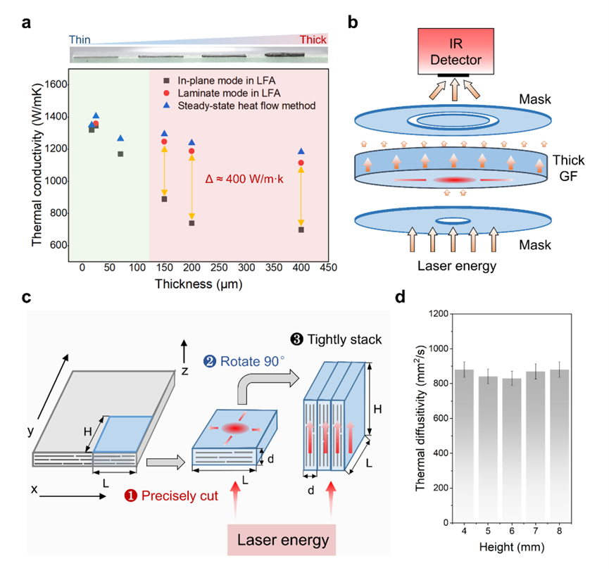 图4 (a)不同厚度石墨烯膜在不同测量方法下得到的导热系数。(b)石墨烯厚膜的热输运在平面内和平面间同时发生。(c) 激光闪射仪“Laminate”模式测量示意图。(d) “Laminate”模式下不同高度的同一样品测量得到的导热系数。