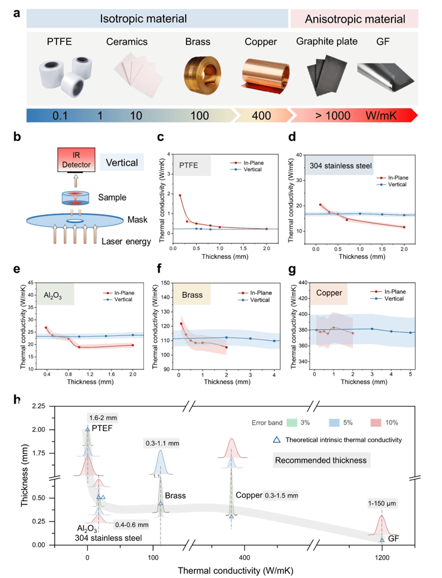 图5 (a)不同导热系数的不同材料。(b)激光闪射仪垂直模式测量热扩散系数的示意图。采用面内和垂直模式测量得到的不同厚度的各向同性材料的导热系数,包括(c) PTFE, (d) 304不锈钢, (e) Al2O3, (f)黄铜和(g)铜。(h)面内模式测量中不同导热范围的材料的推荐厚度。