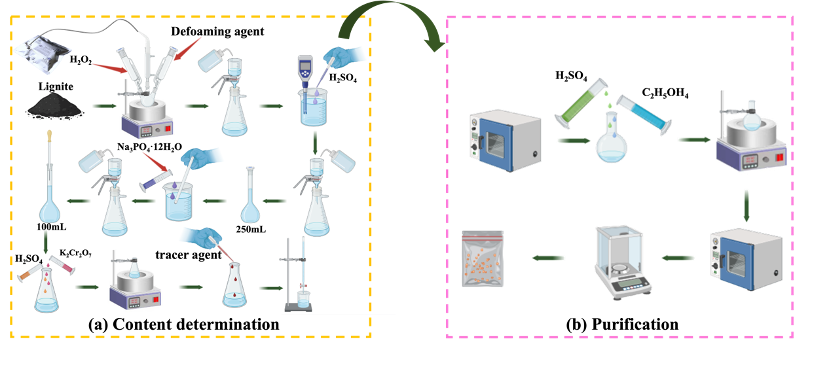 褐煤是一种棕黑色、无光泽的低品位煤,介于泥炭煤和烟煤之间。褐煤的特点是灰分高、含水量高、挥发性物质含量高、热值低,所有这些都对可控燃烧提出了挑战。人们的注意力已经转向使褐煤中固有的丰富碳和矿物化学成分多样化,以生产可持续的非能源产品。黄腐酸(FA)的生产是提升褐煤经济和环境价值的非能源产品之一,研究从褐煤中提取褐煤黄腐酸已成为提高褐煤有效利用率的活跃研究领域。黄腐酸在生态修复、废水处理、医药和农业等各个领域得到了广泛的应用。因此,研究从褐煤中提取黄腐酸的反应机理对于合理有效地利用黄腐酸的理化性质至关重要。此外,黄腐酸的结构复杂。现有研究尚未对黄腐酸的形成机理进行全面研究,限制了其科学应用。多年来,许多研究人员采用离子交换树脂、碱溶酸沉淀等方法从褐煤中提取黄腐酸,但提取效果差,并且现有的研究大多集中在黄腐酸的提取和应用上,而缺乏对黄腐酸形成机理的研究。本研改变酸碱溶解环境以提高黄腐酸的产量,为黄腐酸的分子结构提供新的见解。