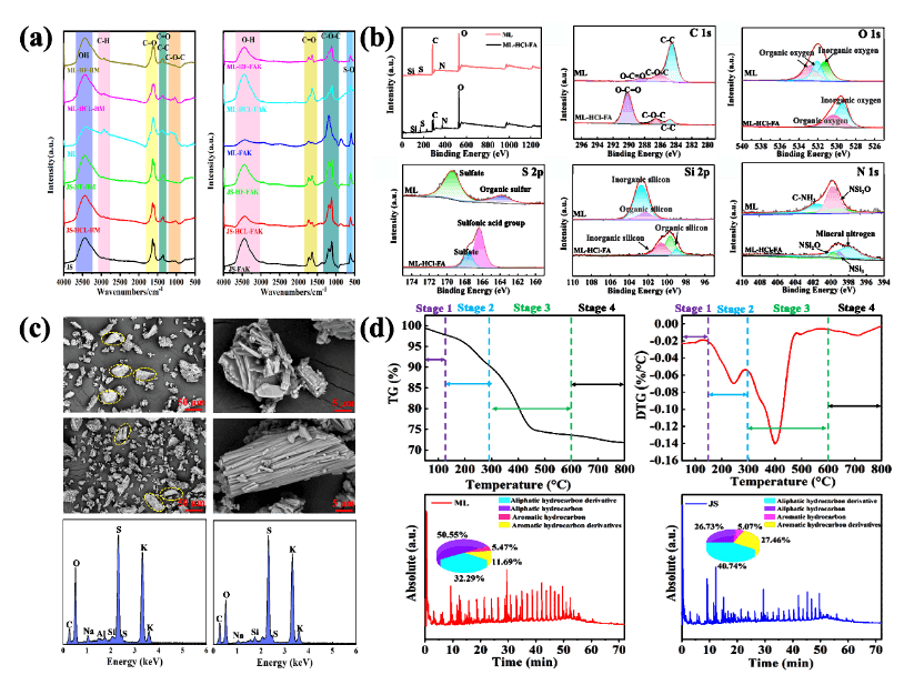 图2.黄腐酸的FTIR、XPS、SEM、TG和Py-GC/MS的表征。