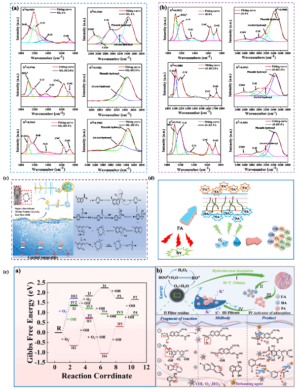 云南大学袁申富课题组和云南云天化股份有限公司合作,以褐煤为原料,H2O2和NaOH/KOH氧化褐煤制备煤基黄腐酸,相关成果已申请了发明专利(一种混合活化剂水热氧化从褐煤中提取黄腐酸和黄腐酸盐的方法:CN202311496779.6,一种从褐煤中高效提取腐殖酸的方法CN202310593115.5)。实验结果表明,用HCl对弥勒(ML)褐煤进行酸洗,可以去除铁、铝、钙等金属离子,以该褐煤为原料,反应时间150 min,温度50 ℃,H2O2 (30%)与KOH (3 mol/L)体积比为1:1,H2O2和KOH对黄腐酸提取效果最好达60.49%。加入消泡剂,大大减少了气泡的存在,防止了二氧化碳的产生。气相色谱法检测N2含量降低。FTIR、XPS、Py-GC/MS等结果表明,黄腐酸具有较多的极性官能团(-COOH、-OH)和O-C=O结构。因此,在反应过程中产生大量的黄腐酸分子。利用密度泛函理论(DFT)计算了煤基黄腐酸形成过程中的吉布斯自由能1.3~1.7 eV。本研究对褐煤腐殖化的促进作用及黄腐酸的形成过程提供理论支持。