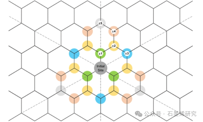 图1.氧化官能团在氧化石墨烯上的不同分布位点。中间的灰色圆盘表示与原始氧化官能团结合的初始位点,其他不同距离和相对位置的位点用不同颜色和数字标记的圆盘来区分。正数表示这里的氧化官能团与原氧化官能团分布在氧化石墨烯的同一侧,负数表示这里的氧化官能团与原氧化官能团分布在氧化石墨烯的相反一侧。