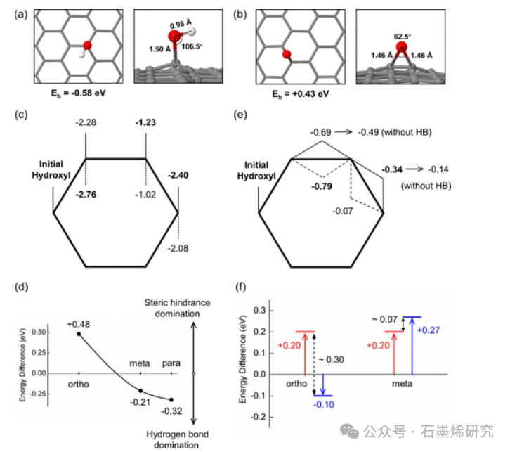 图2: 优化了(a) h1和(b) e1的结构和结合能。灰球代表碳原子,红球代表氧原子,白球代表氢原子。(c)不同构型h2的Eb,其中实线表示表面h2,虚线表示表面h2。(d)不同分布部位表面h2与表面h2的Eb差异。(e)不同构型下h1e1的Eb,实线表示表面h1e1,虚线表示下表面h1e1。HB表示氢键,后面的值(不带HB)表示表面h1e1的Eb,其中O-H不指向环氧基团,不形成氢键。(f)不同分布点h1e1的Eb差值,以各分布点地表h1e1最稳定的Eb值为基线,设为零。红线表示不同方向上表h1e1的Eb差,蓝线表示表前h1e1与表h1e1的Eb差。