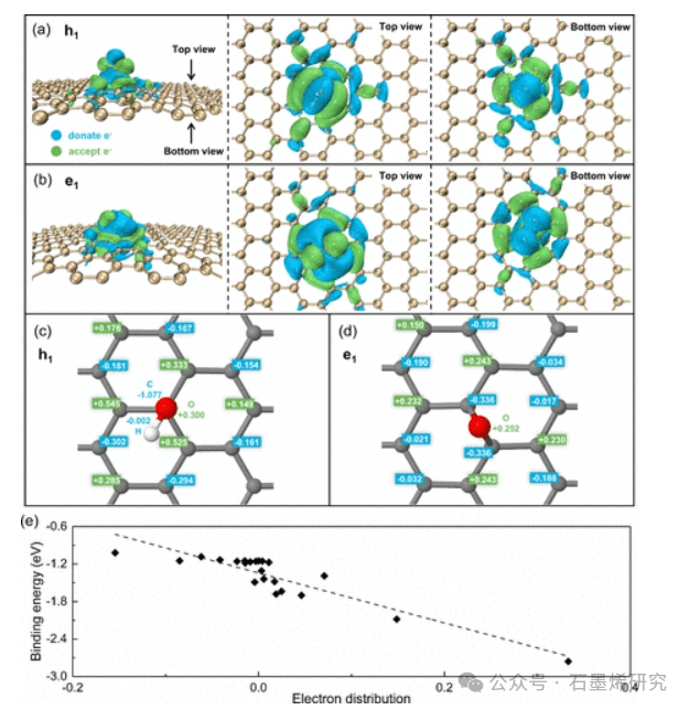 图3. (a) h1和(b) e1的电子密度差分析。等值为±0.0005 e –,其中电子给予量大于0.0005 e –的区域为蓝色,电子接受量大于0.0005 e –的区域为绿色。重复(c) h1和(d) e1的电荷分析,其中正值表示接受电子,负值表示给予电子。(e)氧化石墨烯表面h2的结合能与电子分布的关系。