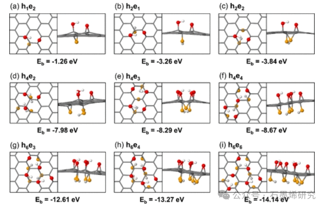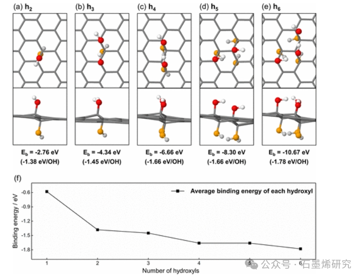 图4. (a) h2, (b) h3, (c) h4, (d) h5, (e) h6最稳定的结构和结合能。(f)从h1到h6最稳定结构中每个羟基的平均结合能。红色球代表氧化石墨烯平面上方的氧原子,白色球代表氧化石墨烯平面上方的氢原子,橙色球代表氧化石墨烯平面下方的氧原子,浅灰色球代表氧化石墨烯平面下方的氢原子。