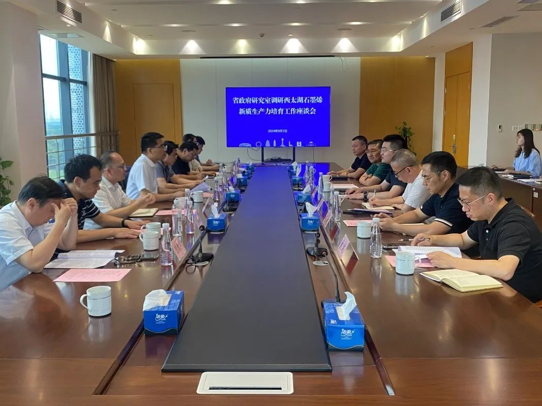 2024年9月3日,省政府研究室赴西太湖调研石墨烯产业,听取新质生产力培育工作情况报告,并组织企业座谈交流。市政府办副主任莫千仁,市科技局高新处二级主任科员倪新宇,园区领导沈立人,企业代表常州第六元素、常州二维碳素参加座谈。
