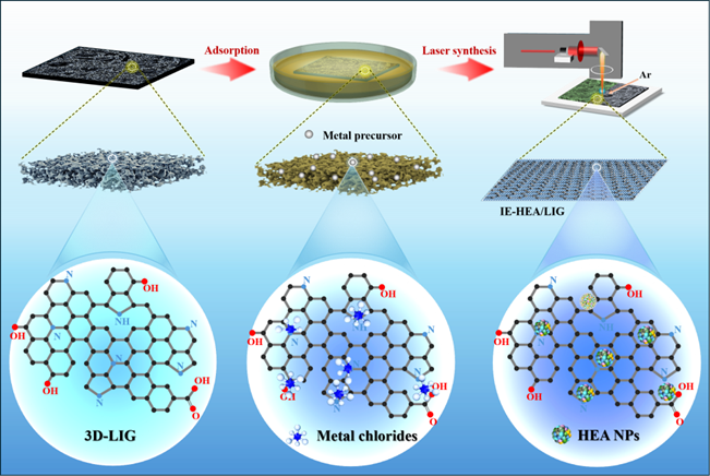 该团队将激光诱导石墨烯(Laser-induced graphene,LIG)浸没在五种金属前驱体盐混合溶液中,干燥后固态金属前驱体吸附在3D多孔石墨烯结构上,经过激光辐照制备出具有尺寸均匀、无相分离, 石墨烯层包裹特殊结构的高熵合金纳米颗粒。同时,以碳纸为支撑物,直接制备出负载型纳米颗粒自支撑催化电极。制备过程如图1所示。