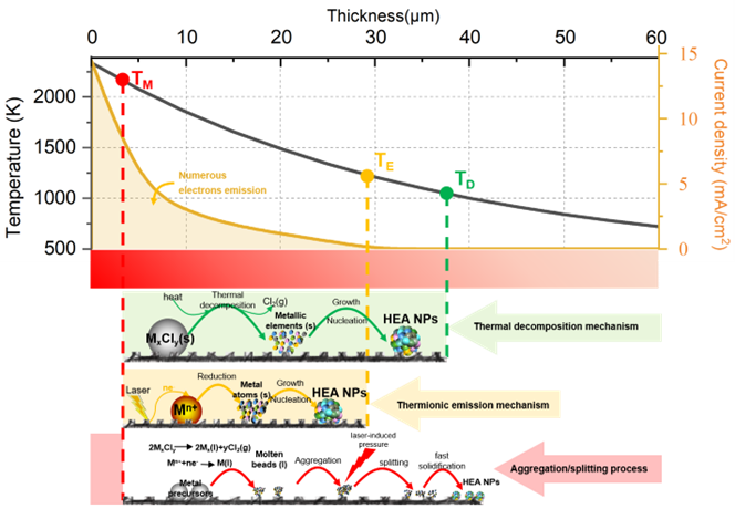 他们揭示了激光是如何将离子形式存在的金属盐还原成金属单质并形成纳米颗粒的机理。当激光辐照负载前驱体盐的石墨烯时产生两个现象:一是脉冲激光辐照产生的热量使前驱体盐发生热解;二是激光辐照下石墨烯载体在一定温度下产生大量热发射电子。基于这两个现象,他们提出合成机理包括三个过程:即热解过程,热电子还原过程和熔融金属聚集破裂过程。这三个过程与载体温度变化密切相关,脉冲激光辐照下100 μs内石墨烯的温度升至金属的熔点以上,同时在107 K/s的冷却速度下,形成了成分和尺寸均匀的纳米颗粒。