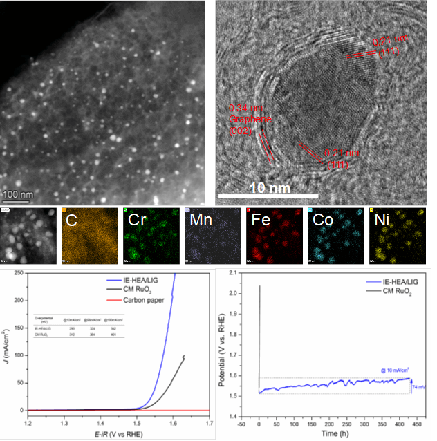 该团队还深入研究了石墨烯层包裹纳米颗粒的特殊结构:纳米颗粒被数层石墨烯包裹,包裹是在激光辐照过程中一步形成,无需任何前处理或后处理诱导生成。石墨烯包裹可以限制纳米颗粒的移动和聚集,保证颗粒尺寸均一性。而且,这种包裹结构减少了催化反应中纳米颗粒的剥落,极大提高催化稳定性。制备的负载高熵合金纳米颗粒自支撑催化电极在碱性条件下氧析出反应中电流密度为10 mA/cm2时表现出293 mV的过电位,在428 h稳定性测试后,过电位仅增加74 mV,超过绝大多数金属催化剂。