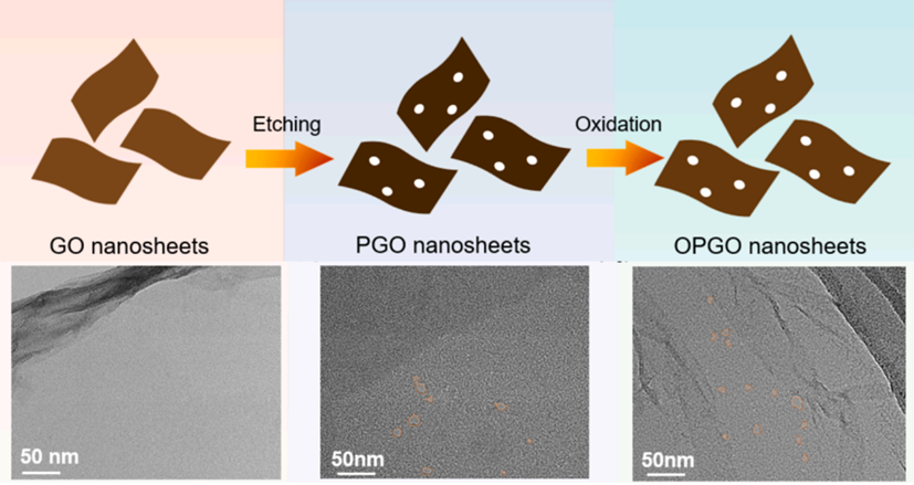 多孔GO(PGO)纳米片制备:将H2O2溶液加入GO分散液,100℃加热回流不同时间,制备的样品命名为PGO-x(x为反应时间)。氧化多孔GO(OPGO)纳米片制备:向 PGO 溶液中加入H2O2溶液,60℃加热不同时间,制备的样品命名为 OPGO-y(y为氧化时间)。3D GO基框架制备:将 GO、PGO 或 OPGO 分散液滴入CaCl2溶液,离心、冰模板处理、真空干燥,样品命名与所用原料相关。通过TEM发现,纳米孔分布在PGO和OPGO纳米片表面。随着PGO纳米片处理时间的延长,产生的纳米孔数量增加,而OPGO纳米片的纳米孔数量保持不变。证明H2O2水溶液可以在相对较高的温度下蚀刻GO纳米片,而在相对较低的温度下,GO纳米片仅发生氧化。