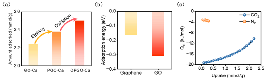 图2a展示了在298 K和1 bar条件下,CO2吸附量从GO-Ca的2.24 mmol/g增加到PGO-Ca的2.38 mmol/g,最终达到OPGO-Ca的2.50 mmol/g。这表明通过优化刻蚀和氧化条件,以及Ca2+交联,可以显著提高吸附剂的CO2吸附能力。OPGO-Ca由于具有更多的孔隙和含氧官能团,提供了更多的吸附位点,因此展现出最高的CO2吸附能力。图2b展示了通过量子密度泛函理论(QDFT)计算得到的石墨烯和氧化石墨烯吸附CO2的能量差异。CO2吸附能量分别为石墨烯的-0.16 eV和氧化石墨烯的-0.31 eV。吸附能量的负值表示吸附过程是放热的,且氧化石墨烯对CO2的吸附能力更强。这解释了为什么尽管OPGO-Ca的比表面积较低,但其CO2吸附能力却更高,因为其与CO2之间的相互作用更强。图2c展示了OPGO-12-Ca吸附剂对CO2和N2的等温吸附热(Qst)。OPGO-12-Ca对CO2的初始Qst值高于N2,表明在无气体吸附的情况下,OPGO-12-Ca对CO2和N2的亲和力有显著差异。较高的Qst值意味着吸附剂与吸附质之间的相互作用更强,即具有更高的吸附能力和选择性。这表明OPGO-12-Ca吸附剂在CO2捕获方面具有优势,尤其是在CO2/N2选择性方面。