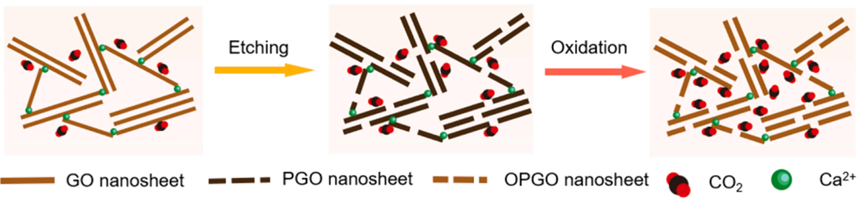 目前约40%的CO2排放来自燃煤发电厂,因此,有效捕获CO2以减少排放对于缓解温室效应至关重要。虽然使用液态胺进行CO2吸收是一项成熟且广泛使用的技术支持燃烧后烟气处理技术,具有高吸附效率,但它存在高再生成本、环境污染和再生过程中的操作系统腐蚀等问题。相比之下,固体吸附剂技术具有能效高、环保和操作简便等优势,展现出捕获CO2的巨大潜力。目前,固体吸附剂的吸附能力远低于液态胺,因此迫切需要开发具有丰富吸附位点和大比表面积的固体吸附剂以增强CO2吸附能力。氧化石墨烯(GO)以其超过2000 m2/g的特定表面积和丰富的含氧官能团(如羟基、环氧基和羧基等)被认为是构建固体吸附剂用于CO2吸附的有前景的二维材料。然而,GO纳米片的聚集覆盖了众多活性位点,削弱了CO2捕获能力。因此,本文提出了通过刻蚀和氧化处理来定制GO纳米片的微结构,以增强活性吸附位点,提高CO2吸附性能。