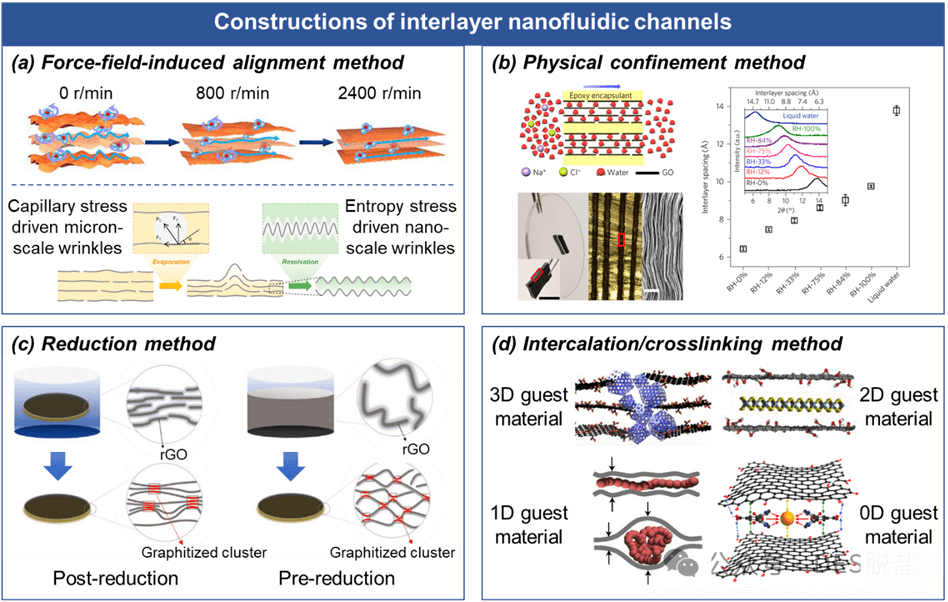 图3.层间纳米流体通道的构筑. (a)力场诱导排列法;(b)物理限制法;(c)还原法; (d)插层/交联法