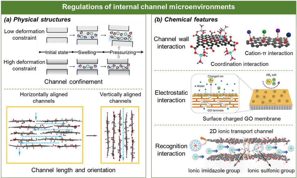 图4.纳米流体通道内微环境的调控. (a)物理结构(通道高度、长度、方向等);(b)化学特征(壁面官能团、活性位点、电荷性等)