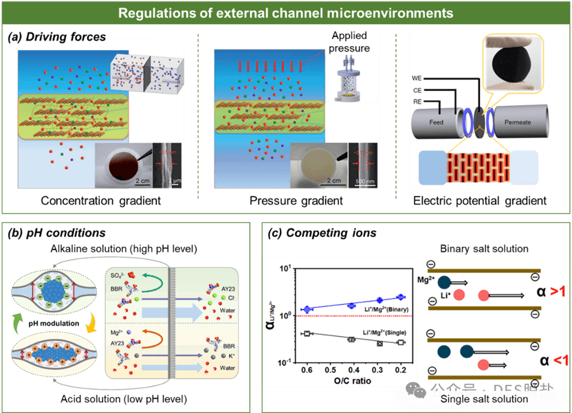 图5.纳米流体通道外部微环境的调控. (a)驱动力;(b) pH条件;(c) 竞争离子