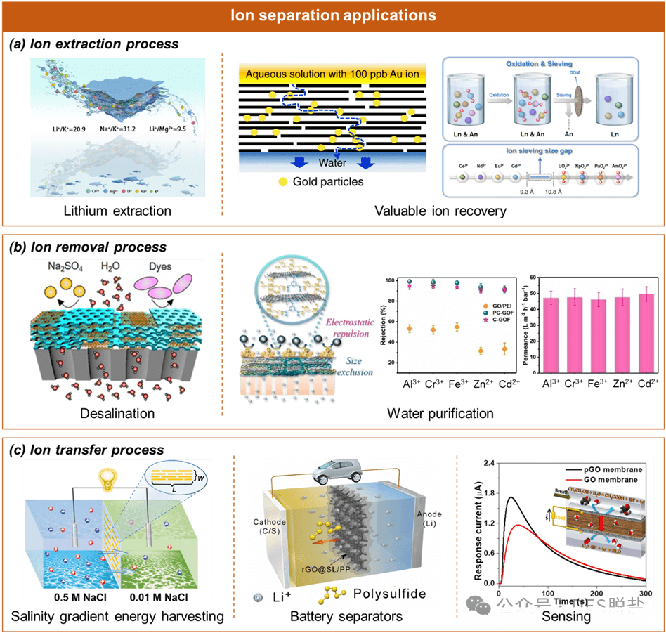 图6.离子分离的应用领域. (a)离子提取领域(提取锂资源、贵金属回收等);(b)离子去除领域(脱盐、水纯化等);(c)离子传输领域.(能源收集、电池、传感等)