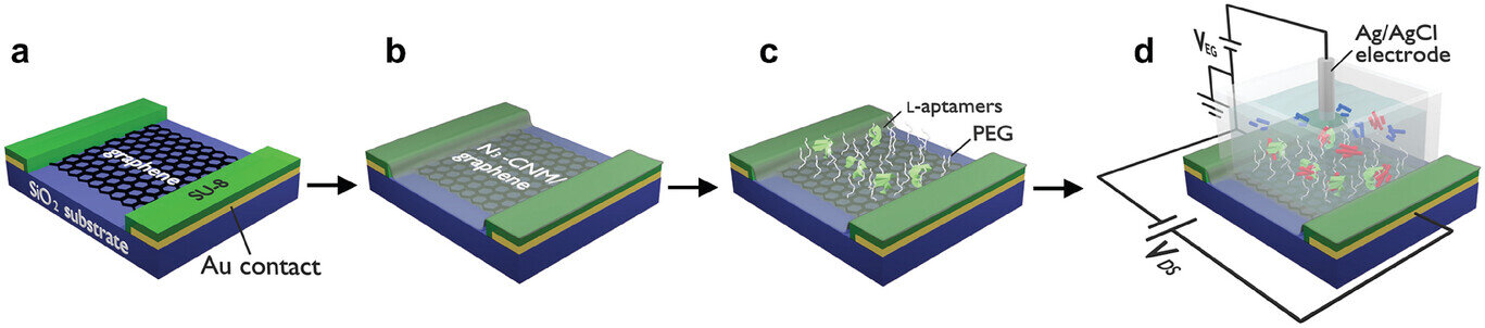 l-AP/PEG-CNM GFET 传感器的制造步骤示意图。来源:《先进材料》(2024 年)。DOI: 10.1002/adma.202407487