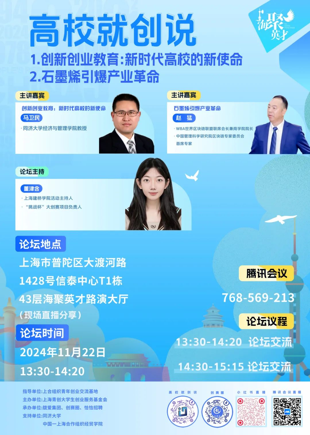 2024 年11月22日,第四十四期高校就创说双主题论坛——“创新创业教育:新时代高校的新使命”和“石墨烯引爆产业革命”顺利举办。两位知名专家、一位主持人及上百位优秀青年通过线下和线上方式参与了本期论坛。