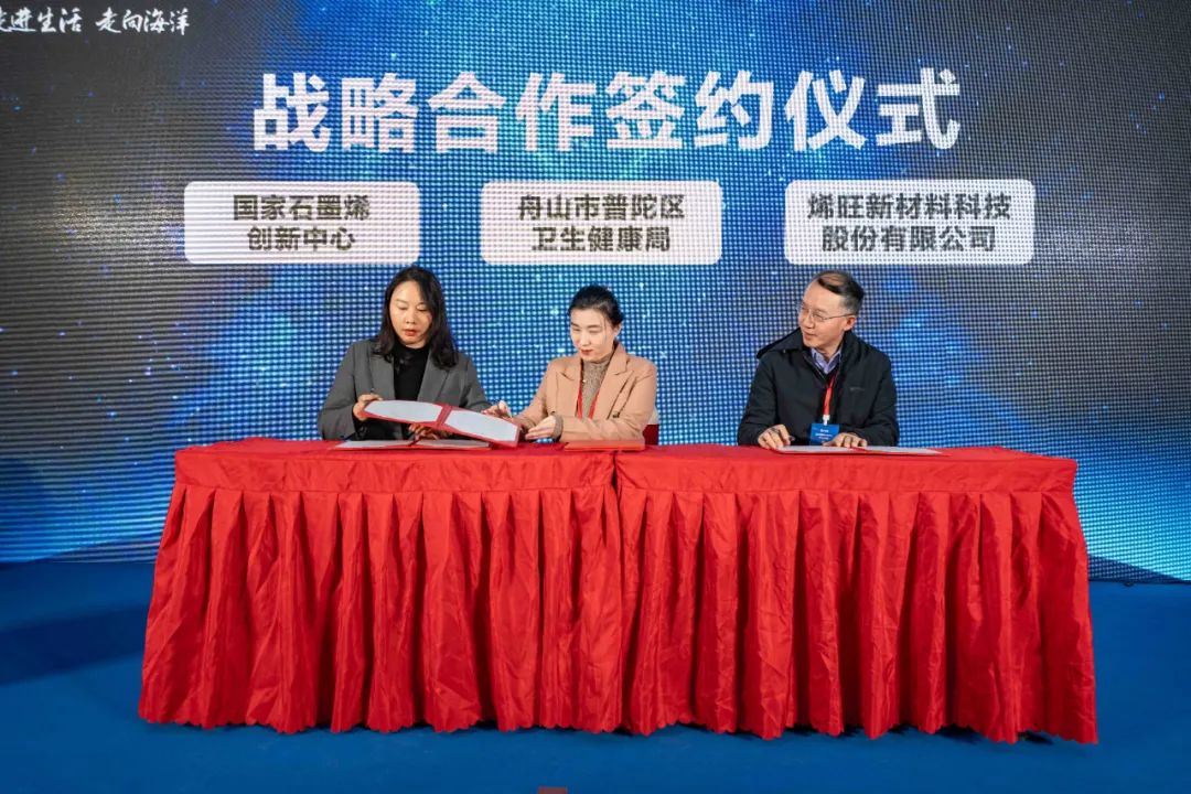 仪式上,舟山市普陀区卫生健康局与国家石墨烯创新中心、烯旺新材料科技股份有限公司进行战略合作签约。随后,与会嘉宾集体参观舟山石墨烯科技馆,国家石墨烯创新中心主任、中国科学院宁波材料所研究员刘兆平作介绍。与会嘉宾详细了解科技馆内陈设展示内容,从相关背景、基础知识、行业信息到石墨烯独特且优异的性能,以及能够赋能产业转型升级和走进千家万户的诸多应用和产品。