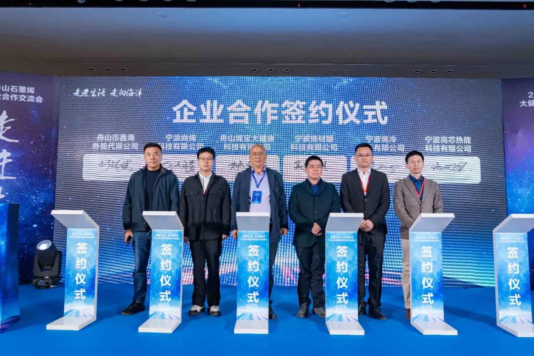 论坛现场,多项合作达成。舟山市鑫海外轮代理公司、舟山烯宝大健康科技有限公司和宁波尚烯科技有限公司、宁波高芯热能科技有限公司、宁波烯冷科技有限公司、宁波烯材暖科技有限公司合作签约。