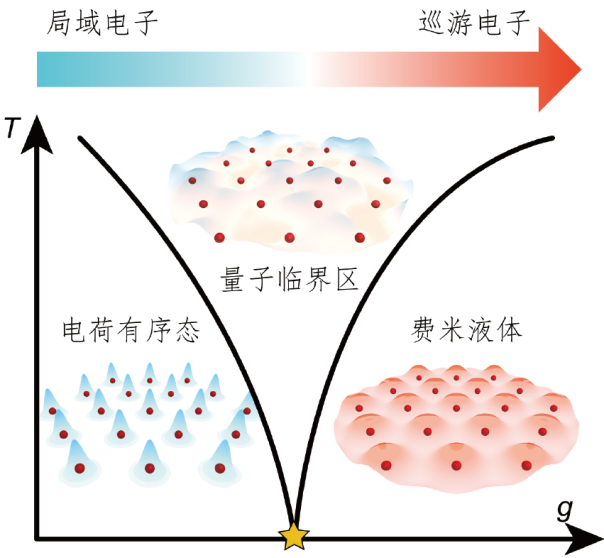 图1 巡游电子-局域电子竞争的典型相图。在外场g的驱动下,电子系统从电荷有序态经历量子临界区域,转变到费米液体态(黑色实线表示不同相之间的边界),在零温下(T = 0),电荷有序态和费米液体态的分界点称为量子临界点(图中金色五角星)。箭头表示在外场作用下,体系中局域电子向巡游电子转变。