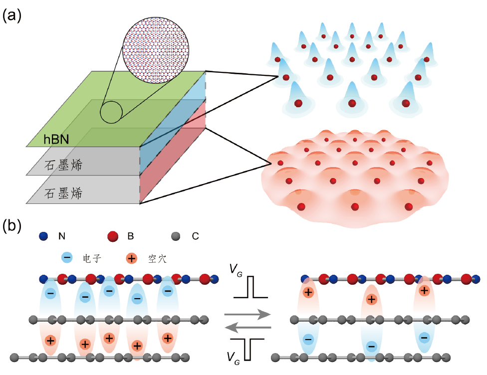 图2 非常规电子型铁电的开关机制。(a)电子铁电器件的结构示意图。hBN与BLG对齐,在界面产生莫尔超晶格,界面莫尔势能够产生局域电子态,同时BLG中具有巡游电子。(b)电子型铁电开关的示意图。体系的局域电子和巡游电子分别占据莫尔界面和石墨烯层,从而产生了面外电极化。通过施加栅压脉冲VG,可以非易失地改变体系局域电子和巡游电子的密度,从而实现铁电极化的准连续开关。