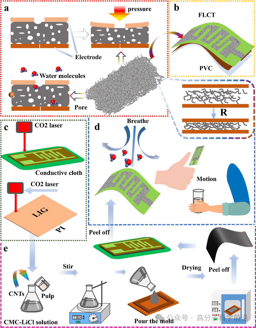 图1:(a) 压力和湿度传感器-FLCT 工作机构的示意图,(b) 结构显示,(c) 激光诱导石墨烯和激光加工的 PMMA 模板,(d) 应用示意图,以及 (e) 实验制备过程。