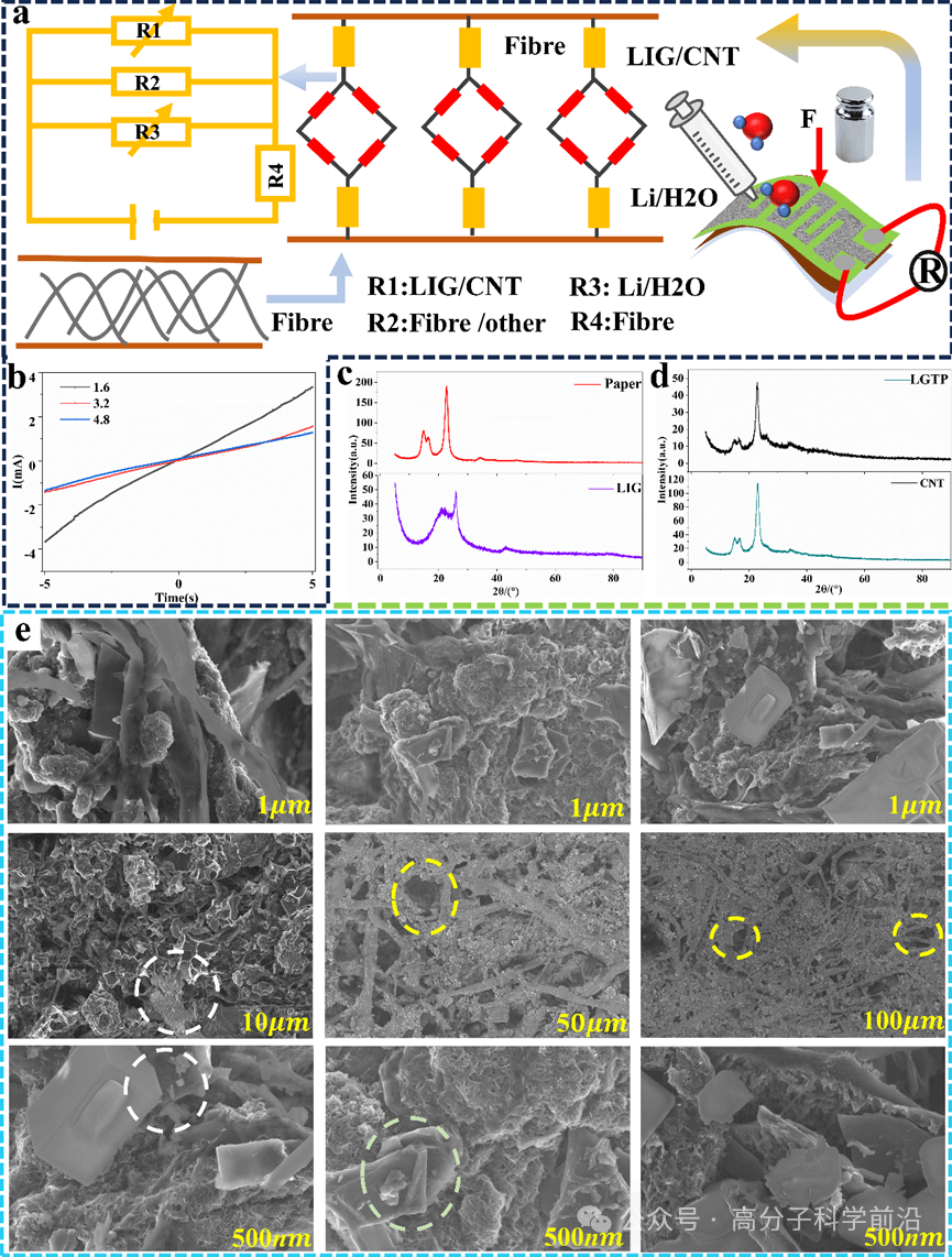 图2:性能表征 (a) 等效电路 (b) 不同纸张含量的伏安特性曲线 (c) LIG 和纸张的 XRD 表征 (d) LGTP 和无 LIG 的 LGTP 的 XRD 表征 (e) 不同放大倍率下双模传感薄膜的 SEM 图像