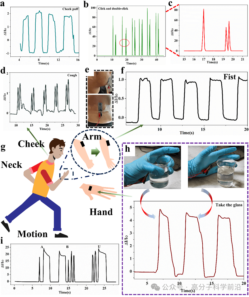 图3:运动监测 (a) 脸颊泡彩 (b) 和 (c) 双击和单击 (d) 咳嗽 (e) 连接到人体的传感器 (f) 握紧拳头 (g) 运动应用演示 (h) 拿着烧杯 (i) 模拟摩斯电码