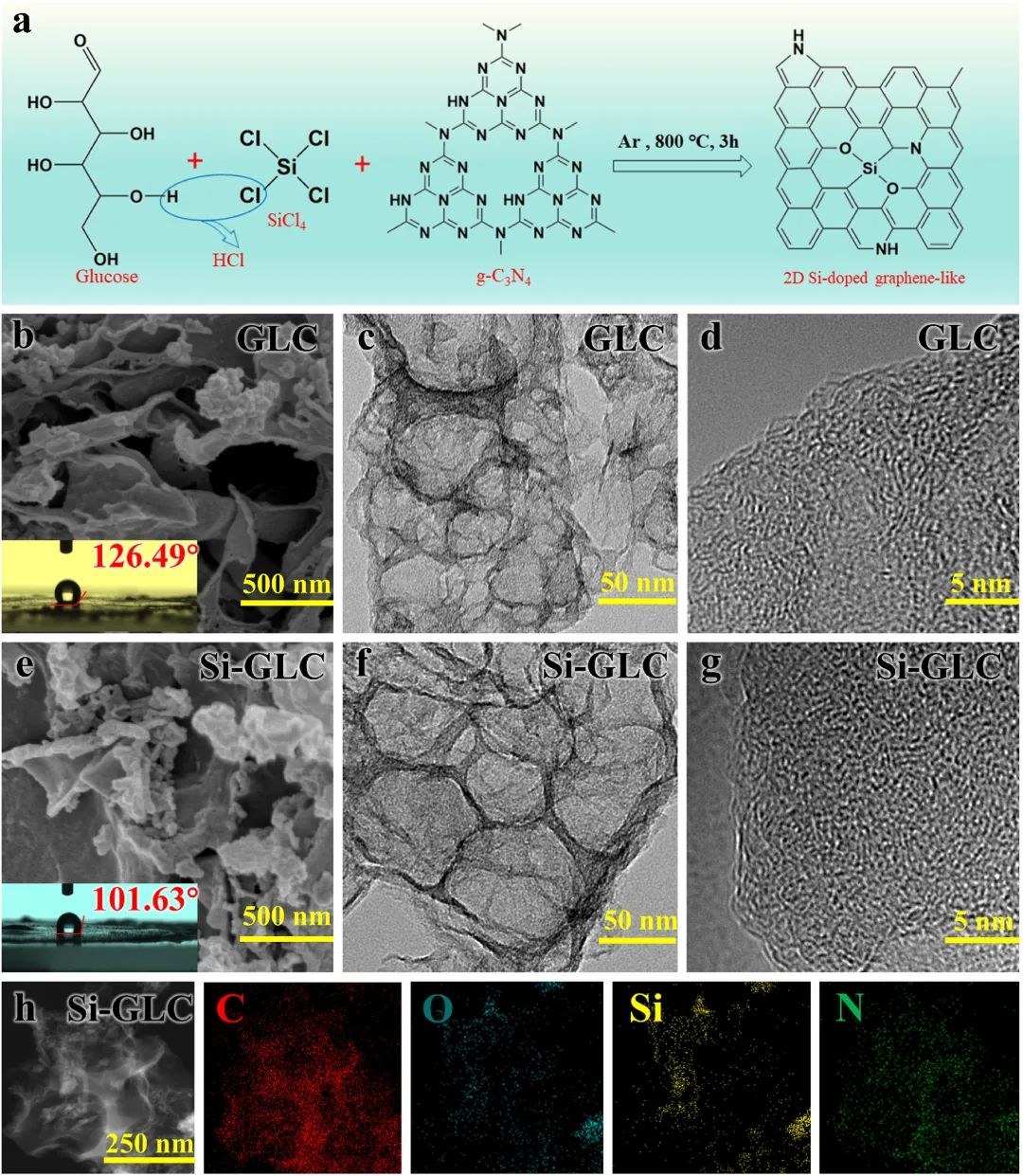 图1:展示了2D硅掺杂石墨烯类材料的制备示意图;GLC和Si-GLC的扫描/透射电子显微镜图像,显示了样品的纳米片结构和微孔结构;Si-GLC的TEM图像和相应的EDS映射显示了硅的成功掺杂和均匀分布。