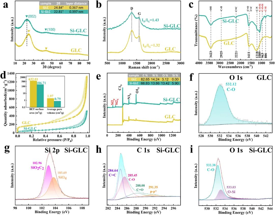图2:XRD、拉曼、FT-IR、N2吸附-脱附等温线图展示了GLC和Si-GLC的晶体结构、晶体学信息、化学键和官能团;XPS全谱和O 1s、C 1s、Si 2p的峰进一步证实了硅的成功掺杂和特定价态。