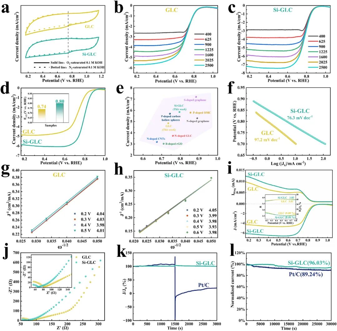 图3:CV曲线、LSV曲线、扩散限制电流密度和半波电位的比较、Tafel曲线、K-L曲线、RRDE伏安图和EIS曲线展示了GLC和Si-GLC的电化学性能,包括ORR活性、电子转移数、H2O2产生百分比和催化剂稳定性。