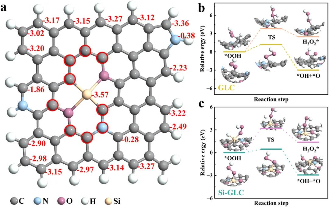 图4:展示了Si-GLC上不同位点的氧吸附能;OOH解离形成O和*OH的能量障碍,以及H添加形成HOOH的过程。