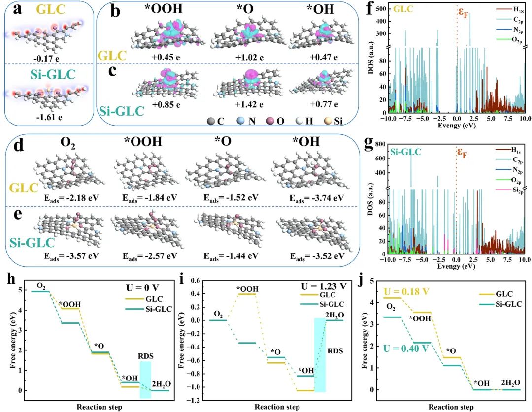 图5:电荷密度差异图、Bader电荷转移数、O2分子、*OOH、O和OH中间体在GLC和Si-GLC模型上的优化配置和吸附能;PDOS计算和在不同电极电位下四电子ORR的吉布斯自由能剖面图。