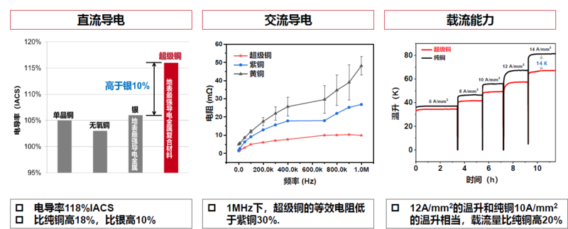 其还从优于纯铜的导热性能、与纯铜相当的机械性能、高低温下导电性能优异、大电流状态下性能稳定、可焊接等角度对超级铜的性能进行了阐述。